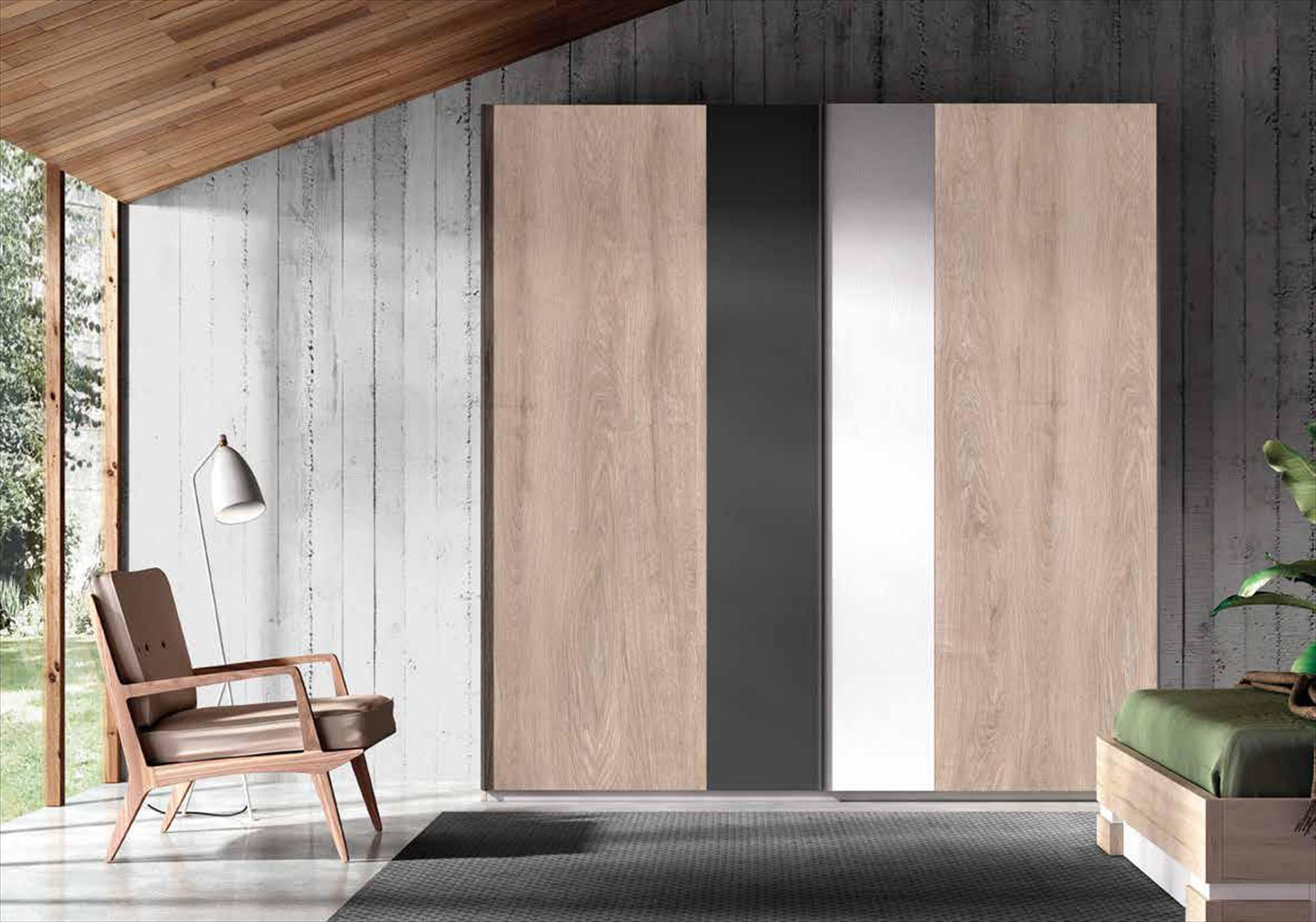 Armario de 2 puertas correderas (o de 3 puertas) disponible en muchas medidas. Su color es el Roble Turner combinado con Blanco y Grafito