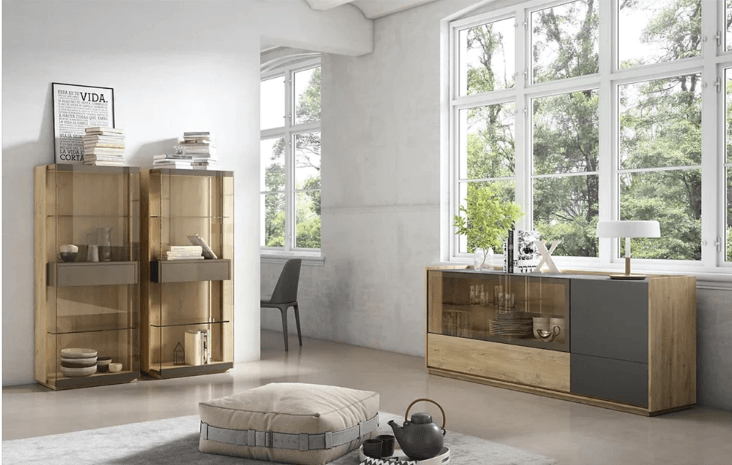Composicíón de aparador y vitrinas en color Nature y Grafeno. Aparador con tapa de Mármol Negro y las vitrinas con cristales frontales y laterales.