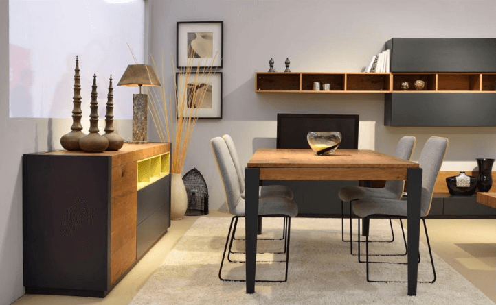 Composición modular y Aparador en Roble Vintage y Gris Elysée Mate. El lacado Amarillo de combinación es opcional. La Mesa es de 160 x 100 con 2 extensibles de 45 cm. Las sillas son a elegir.