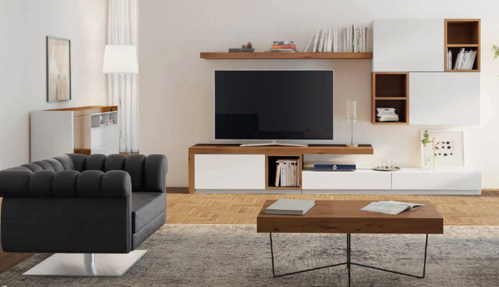 Composición de 294 cm en Crema Mate y Roble Vintage. La Mesa de Centro va a juego y es opcional.