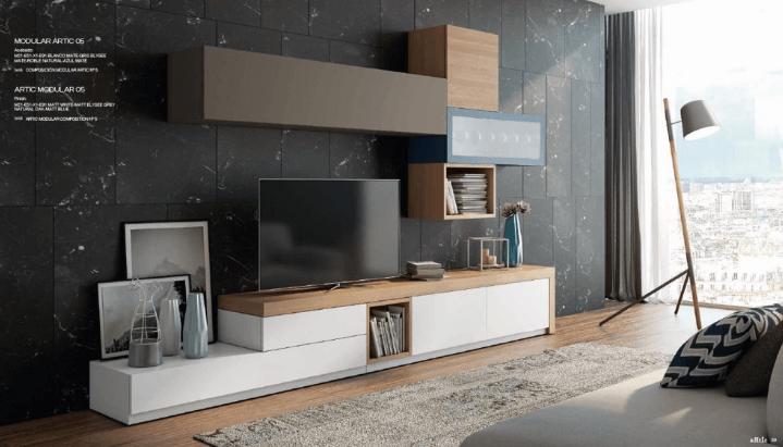 Composición de 312 cm en Roble Natural, Blanco Mate, Gris Elysée Mate y Azul Mate con el poro abierto. Los colores son a elegir.