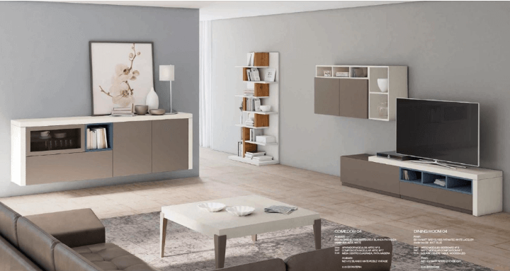 Aparador colgado de 228 cm, Estantería de 90 cm, Mueble TV de 222 cm y Modular colgado de 144 cm, en Gris Elysée Mate y Laca Blanca Patinada / detalles en Azul Mate. La Mesa de Centro va a juego y es opcional.