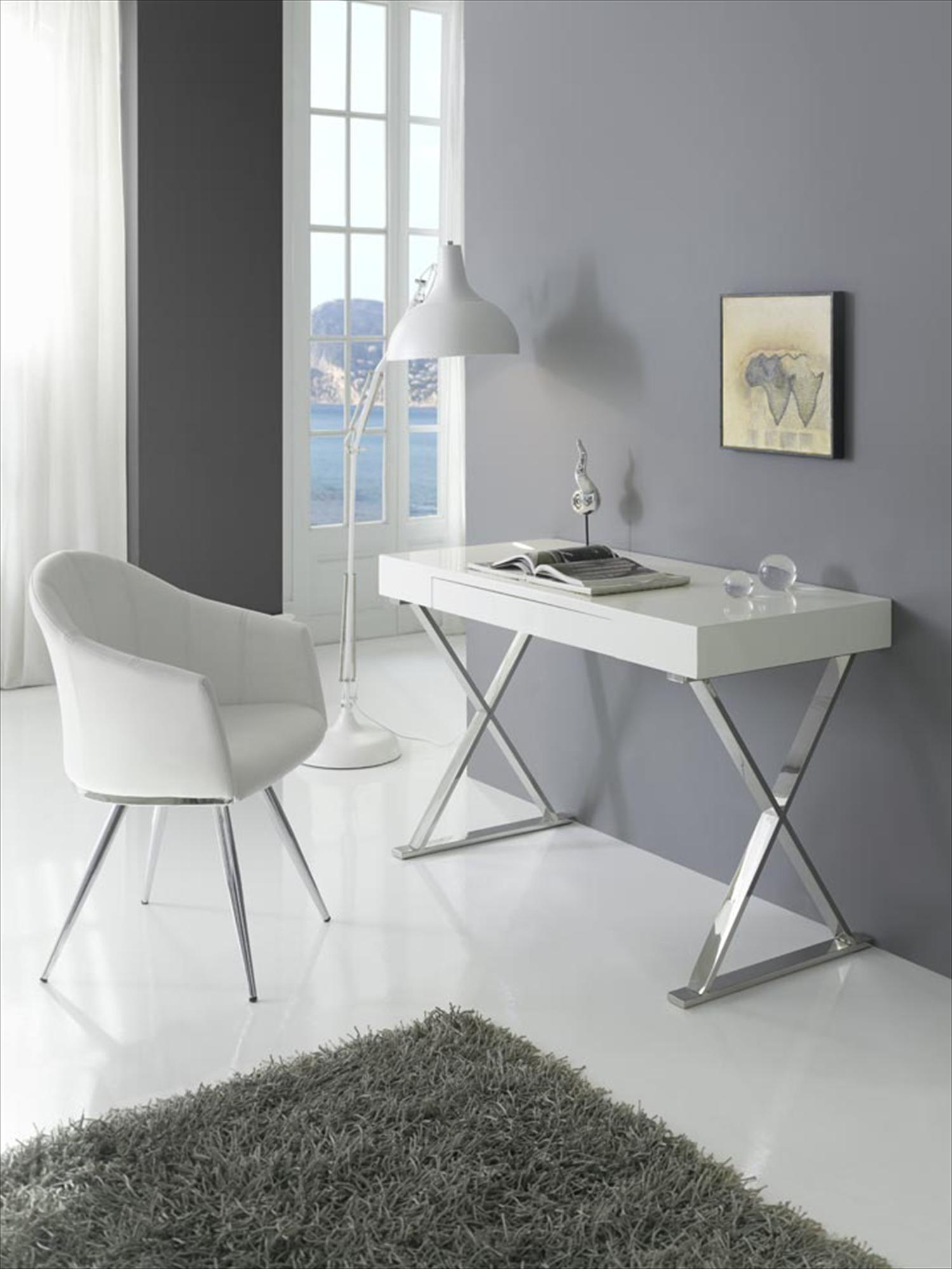 Escritorio con cajón, realizado en Madera lacada en Blanco Brillo, armazón en Metal Cromado.