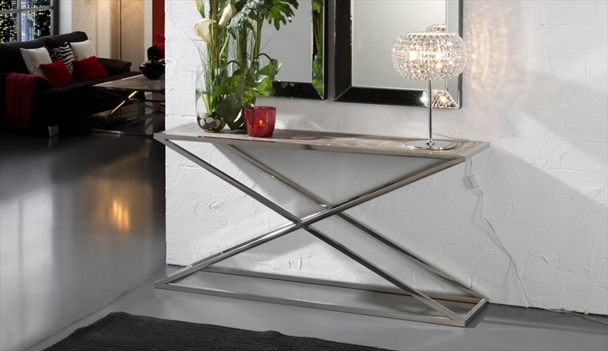 Consola de 150 x 40 fabricada en acero pulido y tapa de madera antigua de Olmo con pátina en Blanco Envejecido.