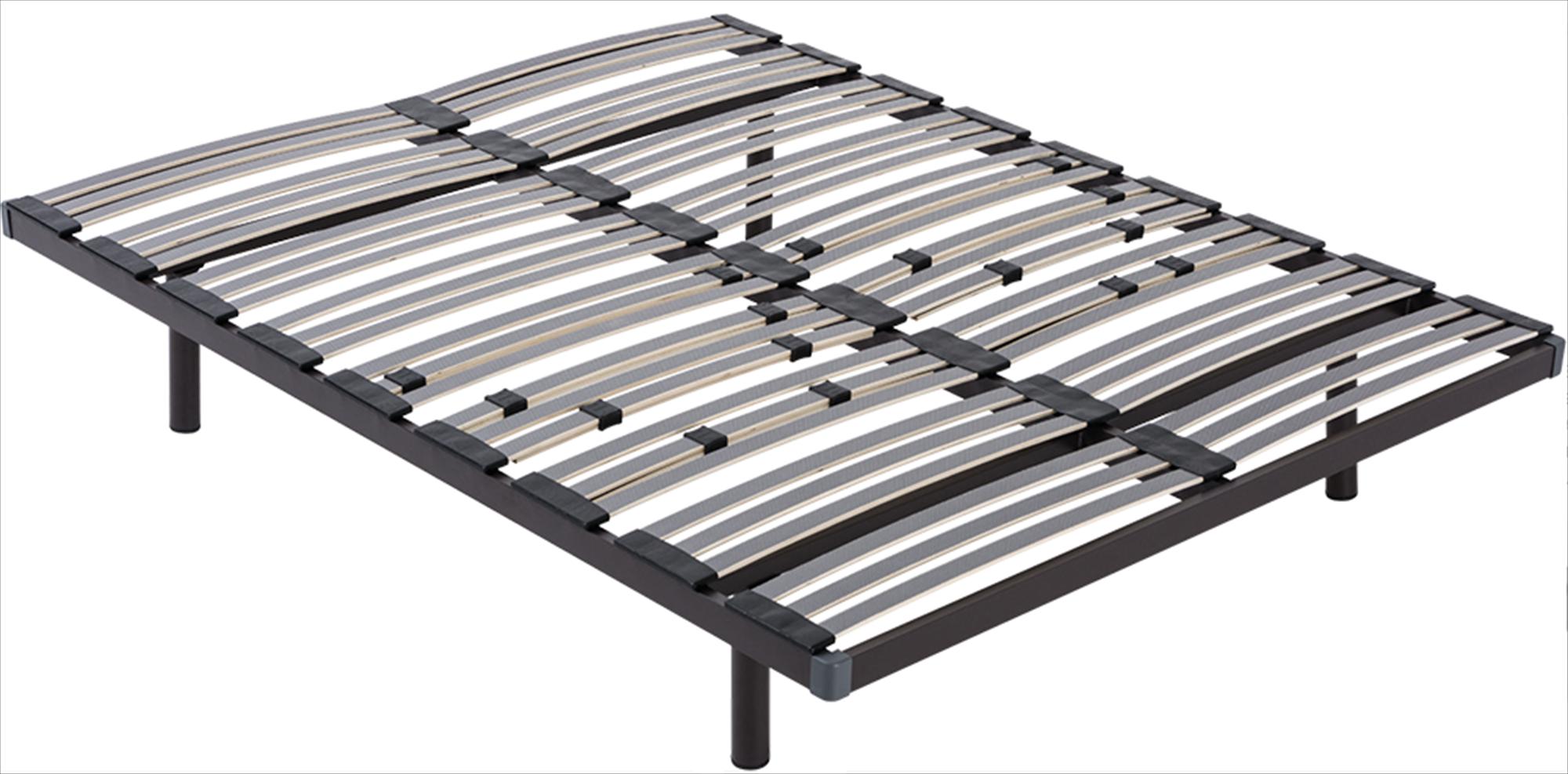 Somier de láminas flexibles, las centrales dobles y regulables en firmeza. Armazón metálico de 50 x 20 con dos barras inferiores de refuerzo que permiten colocar las patas más retiradas hacia dentro para que no molesten al pasar. Patas no incluídas.
