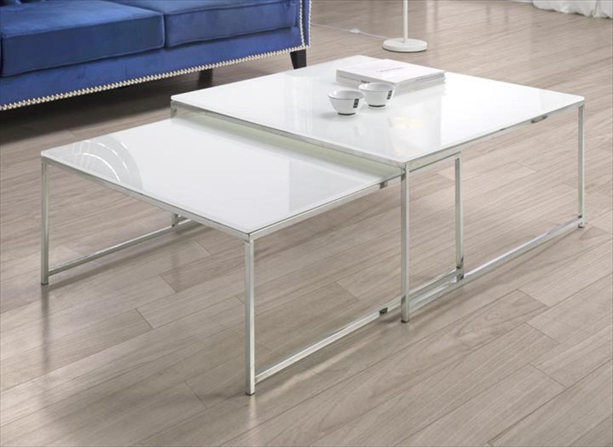 Mesas de Centro superpuestas, en cristal y metal cromado.