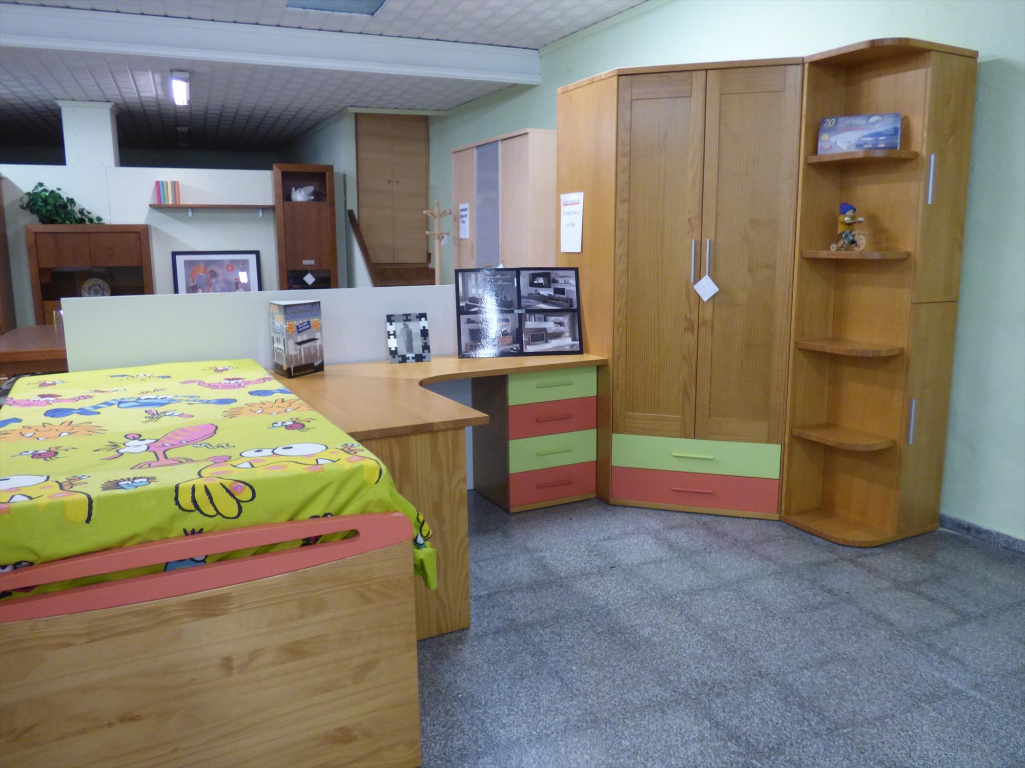 Conjunto juvenil con Armario rincón con terminal curvo, Cama compacta con cajones inferiores y Escritorio rincón. En madera maciza de Pino color Miel, combinada con detalles Rosa y Manzana.
