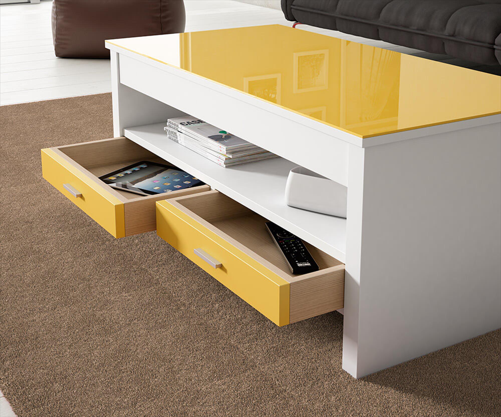 Mesa centro con cajones. Tapa en Cristal o en Cerámica. En todos los colores.