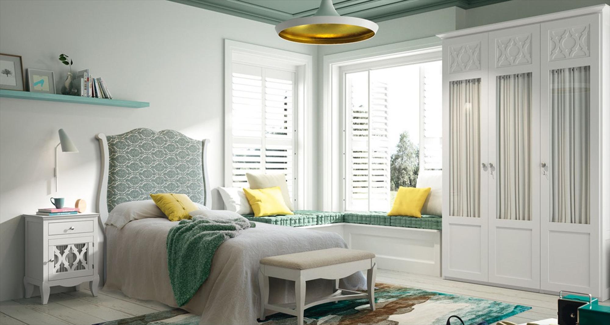 Conjunto 1 en colores Blanco Tosca y Verde Agua. Las puertas pueden ser de visillos o de tablero, con talla o lisas. La Banqueta y el Estante de pared son opcionales. El tapizado del cabezal a escoger. Los colores de la madera siempre a elegir.