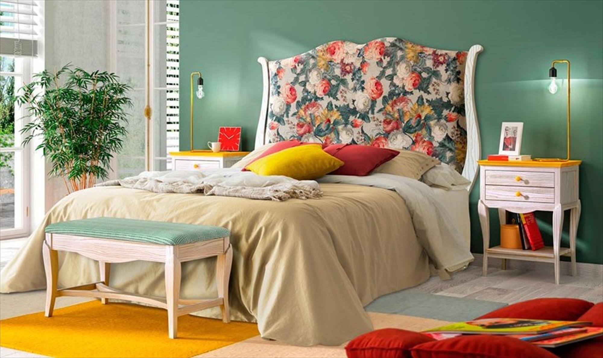 Conjunto de Cabezal tapizado en tela a elegir y Mesitas. La banqueta es opcional y las mesitas también se fabrican de 3 cajones.