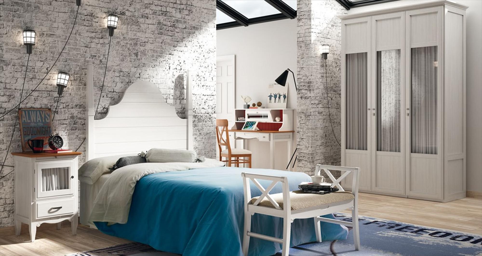 Conjunto 3 en color Blanco Decapé. El armario puede ser con las puertas de tablero, sin visillos. La Banqueta y el Escritorio son opcionales. Los colores siempre a elegir.