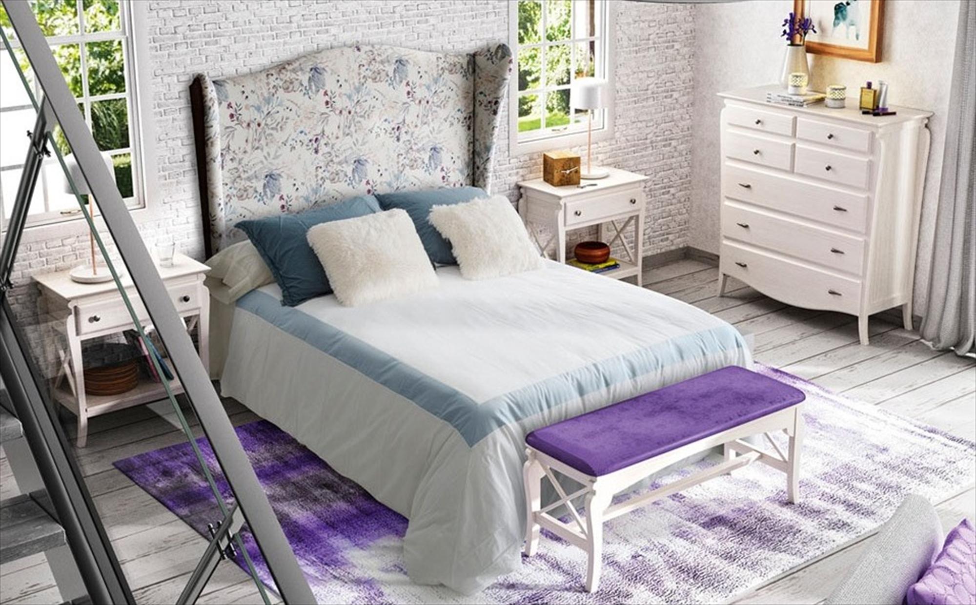 Conjunto de Cabezal tapizado de tela a elegir, Mesitas y Cómoda. La banqueta es opcional y las mesitas pueden ser también de 3 cajones o de 1 cajón con puerta inferior de cortina o de tablero.