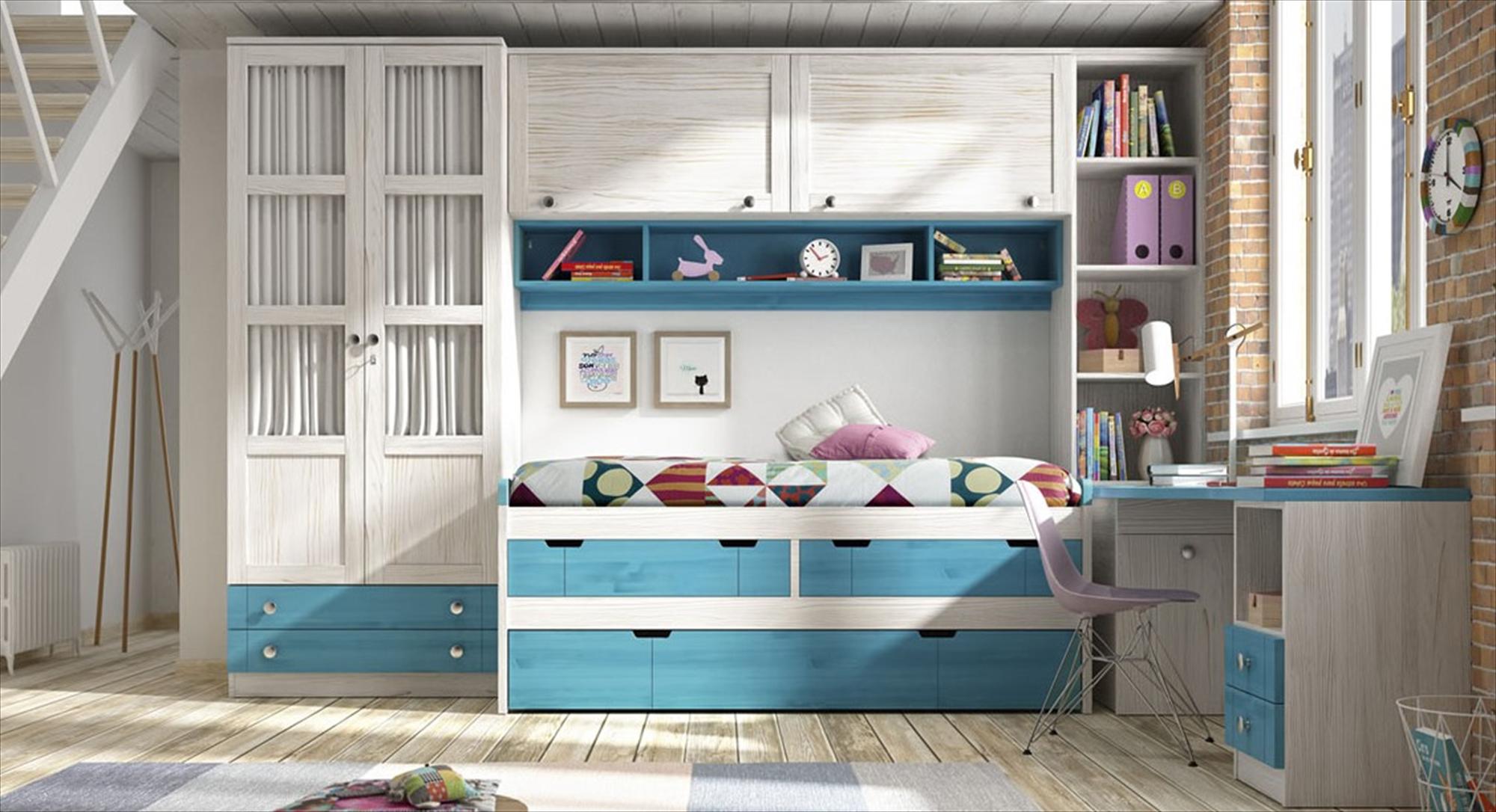 Composición 1 en Blanco Albo y Turquesa con Cama compacta alta con nido inferior. La Tapa del escritorio es curvada. Los visillos se pueden cambiar por tableros. La Silla es opcional. Los colores siempre a elegir