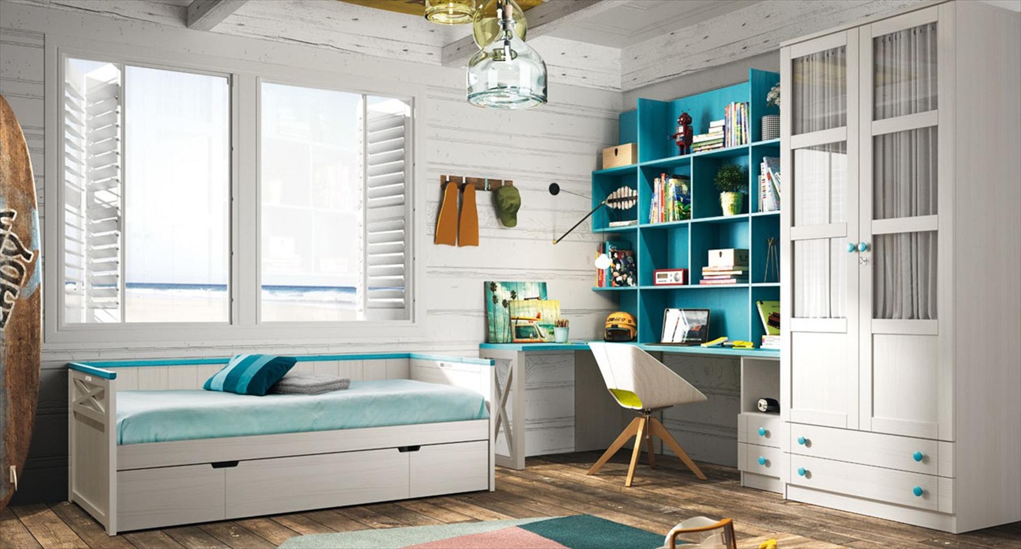 Composición 10 en Blanco Decapé y Turquesa. El Escritorio es de rincón. Los visillos pueden sustituirse por tableros. El Sillón es opcional. Los colores siempre a elegir.