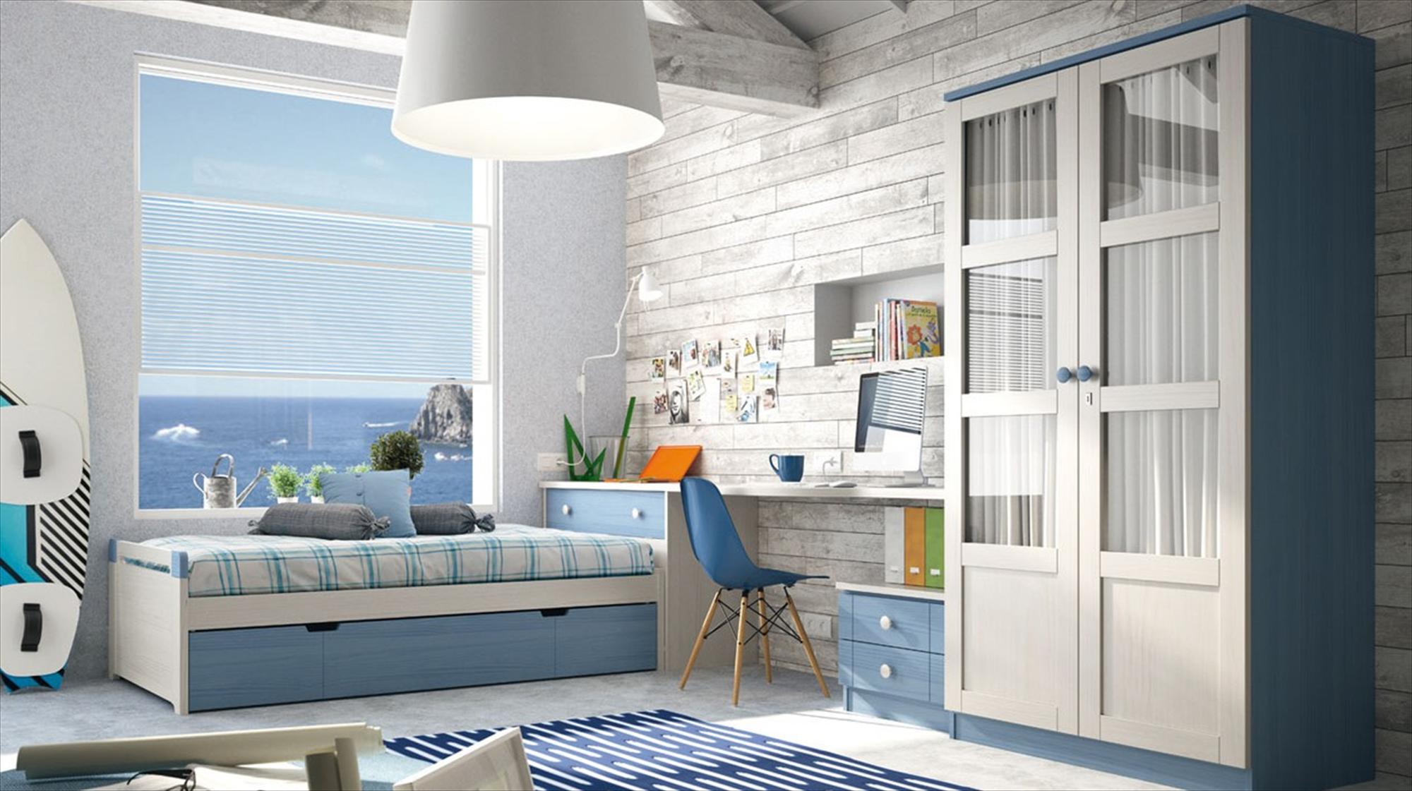 Composición 5 en Blanco Decapé y Azul Cielo. La tapa del Escritorio es curvada. Los visillos se pueden cambiar por tableros. La Estantería y la Silla son opcionales. Los colores siempre a elegir.