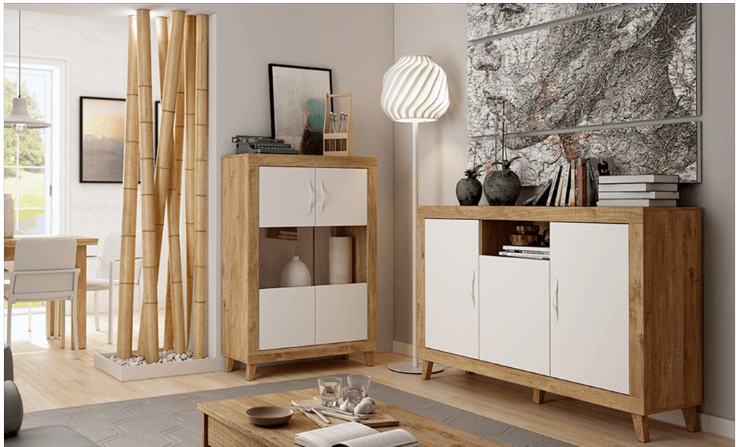 Conjunto en color Roble Viejo con los frentes en Blanco Poro, con las patas modelo Inclinada y los Tiradores modelo Asa. El aparador es de 150 cm y la vitrina de 90. Precios: vitrina con patas 240’00 y aparador con patas 242’00