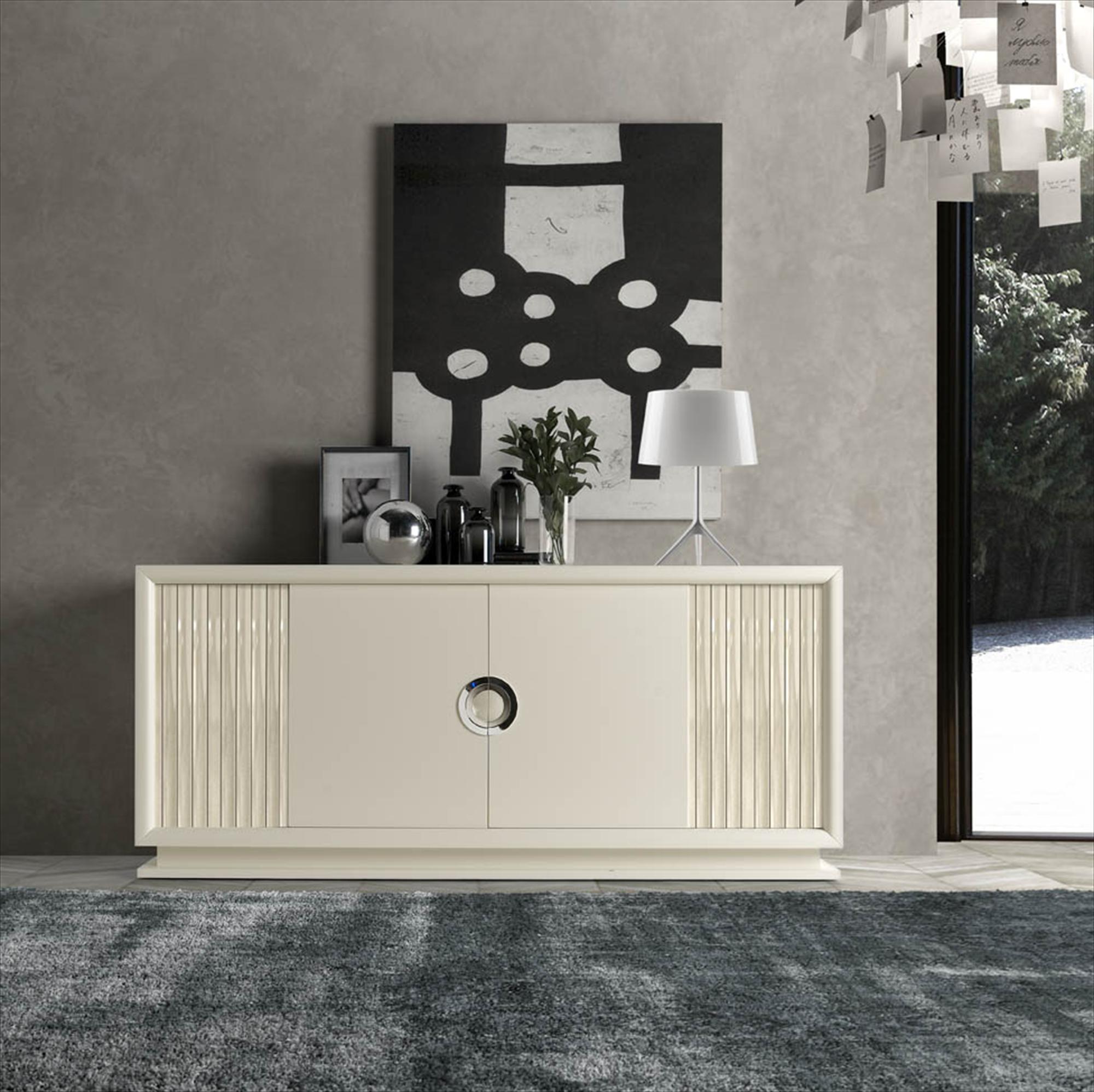 Aparador en color Lino, con detalle de los tiradores redondos.